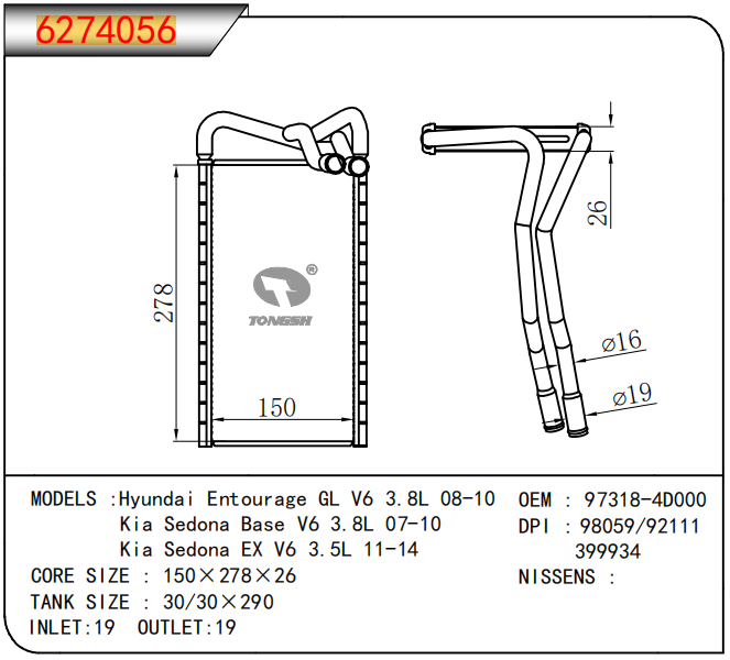 • Hyundai Entourage GL V6 3.8L 08-10 Kia Sedona Base V6 3.8L 07-10 Kia Sedona EX V6 3.5L 11-14