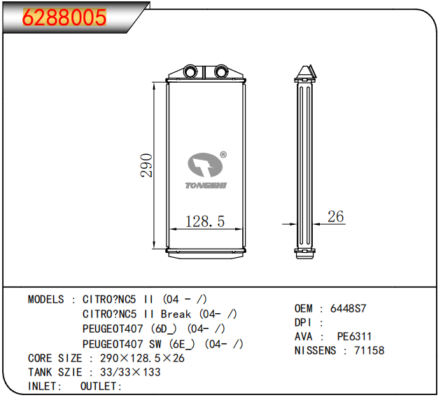 For PEUGEOT CITROEN C5 II 04-/CITROEN C5 II BREAK 04-/PEUGEOT407 (60_) 04-/PEUGEOT407 SW (6E_) 04- OEM:6448S7