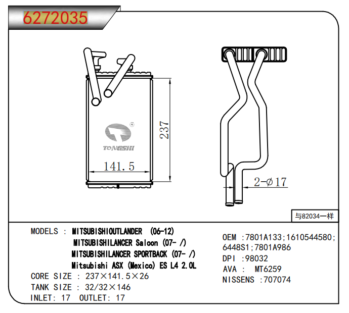 FOR MITSUBISHI OUTLANDER(06-12)MITSUBISHI LANCER Saloon(07- /)MITSUBISHI LANCER SPORTBACK (07- /)Mitsubishi ASX(Mexico) ES L4 2. 0L HEATER